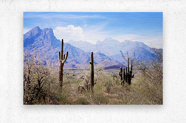 This desert scene featuring Saguaro cactus is in a blue pastel palette using editing software and light painting