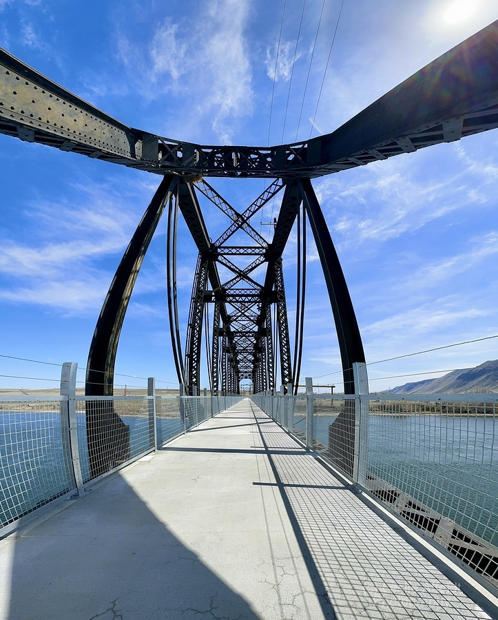 Old railway bridge crossing the Columbia River in central Washington state is now a beautiful pedestrian bridge and part of the Palouse to Cascades State Park Trail